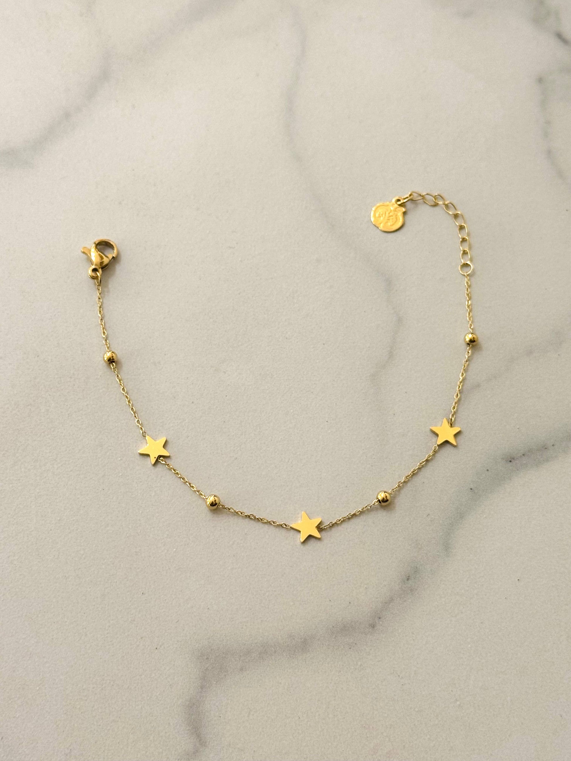 Pulsera minimalista chapado en oro de 18k, diseñada con una delicada estrella que aporta un toque de luz a cualquier look. Fabricada en acero inoxidable hipoalergénico, es totalmente resistente al agua y no se decolora, ideal para llevar a diario incluso con piel sensible. Con una longitud de 16 cm + 5 cm ajustables, forma parte de la colección Minimal y se adapta a tu estilo con elegancia y durabilidad.