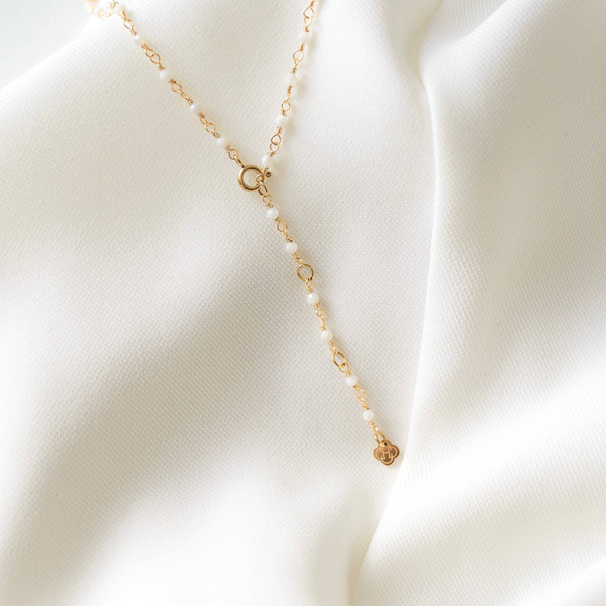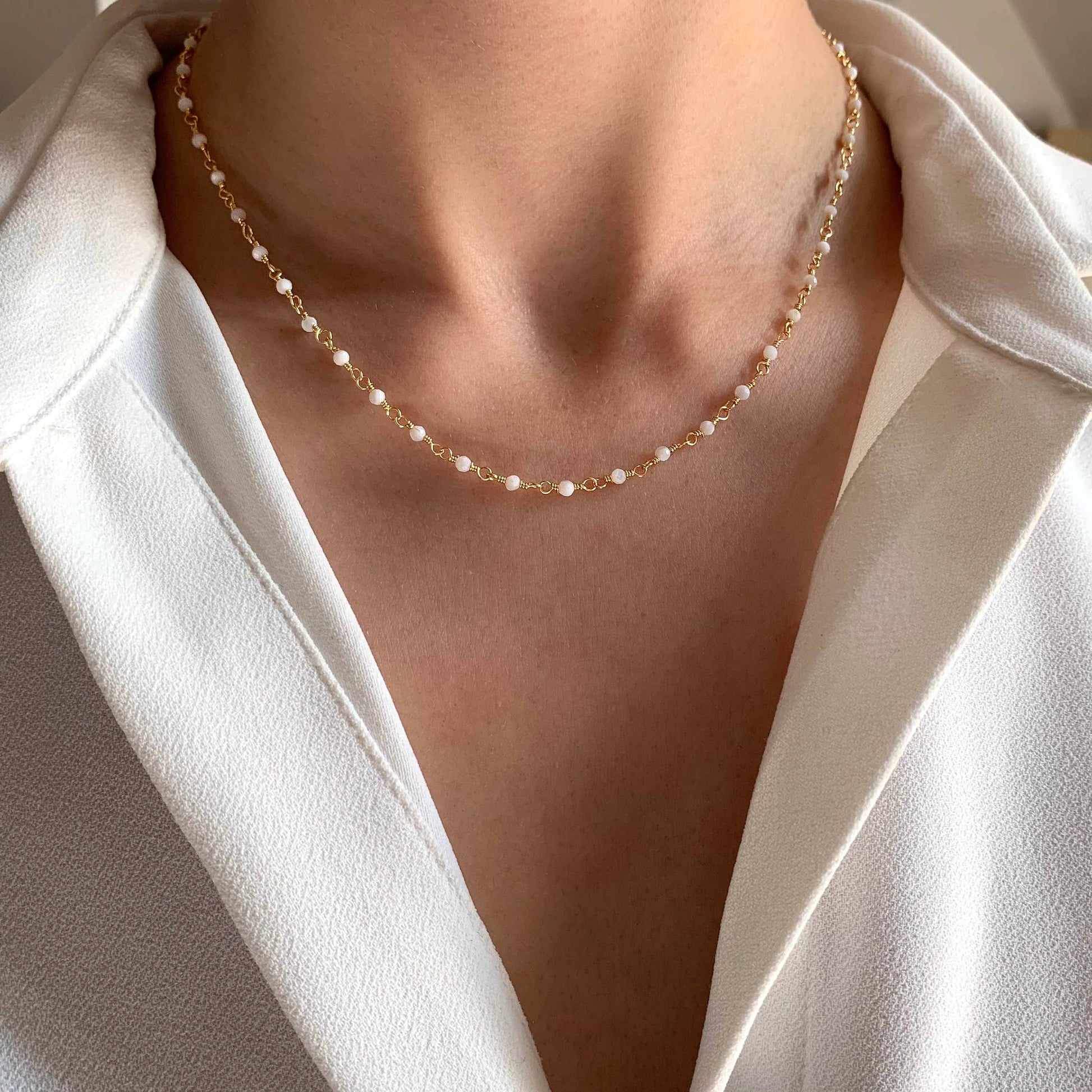 Collar minimalista de acero inoxidable chapado en oro 18k con perlas de ágata blanca natural. Es hipoalergénico, resistente al agua y cuenta con una longitud ajustable (41–47 cm) con cierre cómodo y seguro. Ideal para uso diario o como regalo. Se recomienda evitar el contacto directo con perfumes y químicos para mantener su brillo por más tiempo.
